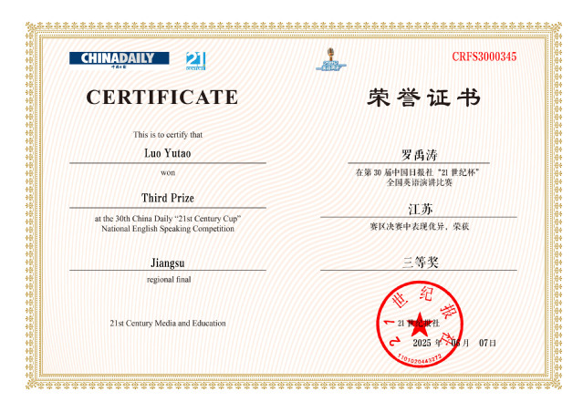 6月7日,第30届中国日报社“21世纪杯”全国英语演讲比赛江苏省赛决赛在南京理工大学圆满落幕。公司选派两名优秀学子参赛,凭借出色的英语表达能力、严密的逻辑思维能力、迅速现场反应力及出色的舞台表现力,伟德bevictor金奕彤同学在来自南京大学、东南大学、南京理工大学等全省80名优秀参赛选手的激烈竞争中脱颖而出,荣获江苏省一等奖,顺利晋级国赛,罗禹涛荣获江苏省三等奖。金奕彤同学作为优秀选手,接受21世纪报记者视频采访。