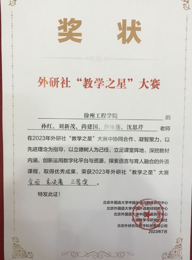 2023年外研社“教学之星”大赛于4月初启动,在历时四个多月的省级初赛、省级半决赛、省级决赛以及全国初赛、全国复赛、全国半决赛等各项比赛环节层层选拔之后,全国共有24支英语专业参赛团队入围全国半决赛,其中江苏省仅有4所高校。孙红老师教学团队以全国复赛特等奖的成绩成功晋级全国半决赛,并最终获得全国总决赛三等奖。