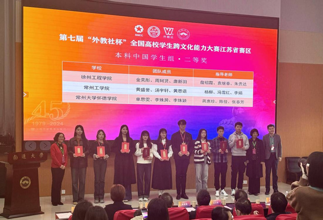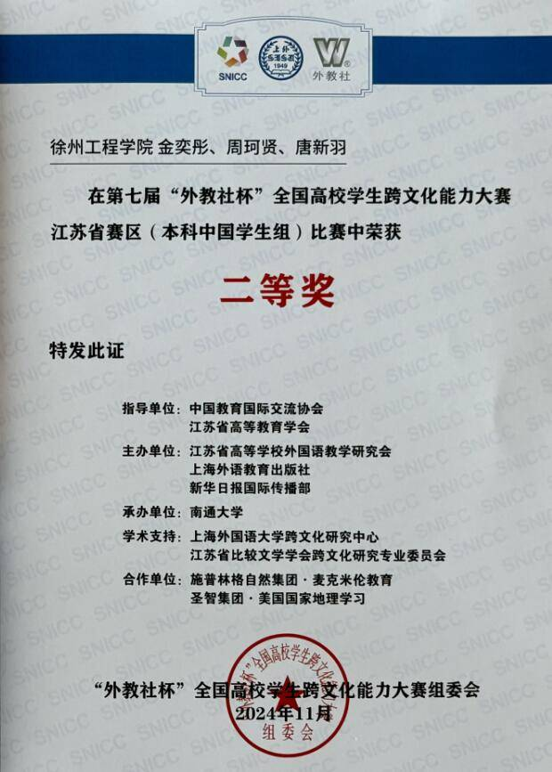 11月1日至11月3日,第七届“外教社杯”全国高校员工跨文化能力大赛江苏省赛区比赛在南通大学成功举办。由公司23英语1班金奕彤、22 汉语言师范专业周珂贤和22化妆品专业唐新羽三位同学组成参赛团队在跨文化案例展析、即兴问答和跨文化名言名句解读三个环节的激烈比拼中获得本科组江苏省二等奖的好成绩。